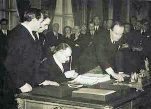 Parigi, 10 febbraio 1947 — Antonio Meli Lupi di Soragna firma per l’Italia il Trattato di Pace imposto dalle potenze vincitrici. Con quell’atto cessò la sovranità italiana su Trieste e venne istituito il Territorio Libero come entità internazionale.