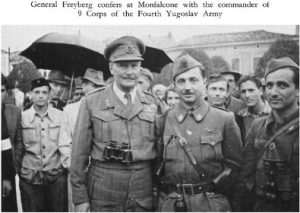 Il generale neozelandese Bernard Freyberg incontra i comandanti del IV Corpo jugoslavo a Monfalcone nel 1945. Un’immagine di apparente cordialità che maschera la crisi politico-militare in atto: le truppe alleate e jugoslave erano a un passo dallo scontro armato per il controllo di Trieste.