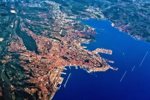 Trieste e porto visti dall’alto. Serve eccome ai corridoi del potere: è la chiave di tutto, ma l’hanno incatenata. La NATO la presidia, l’Italia la nega, e l’Occidente l’ha privata del suo ruolo naturale: scalo ed emporio del bacino balcanico e danubiano.